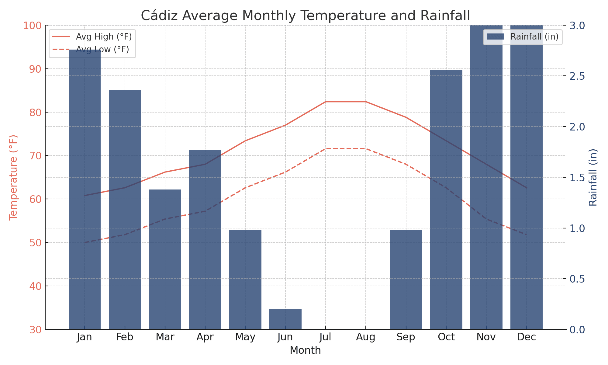 Cádiz enjoys a warm Mediterranean climate, influenced by their coastal and inland locations. Summers are hot and dry, with average highs reaching around 86°F (30°C) in July and August, though the Atlantic breeze helps keep coastal Cádiz more comfortable. Outdoor activities are best enjoyed in the cooler morning or evening hours during this season. Winters are mild, with average lows of around 46°F (8°C) in January, making it a great time for sightseeing without the summer crowds. Rainfall is most common between November and March, though it is generally short-lived. Spring and autumn offer the most pleasant conditions, with moderate temperatures and fewer tourists. These seasons are ideal for exploring historic streets, enjoying the beaches, or experiencing the region’s cultural events, such as the Cádiz’s famous Carnival in late winter. For the best mix of comfortable weather and local festivities, consider visiting during these shoulder seasons.