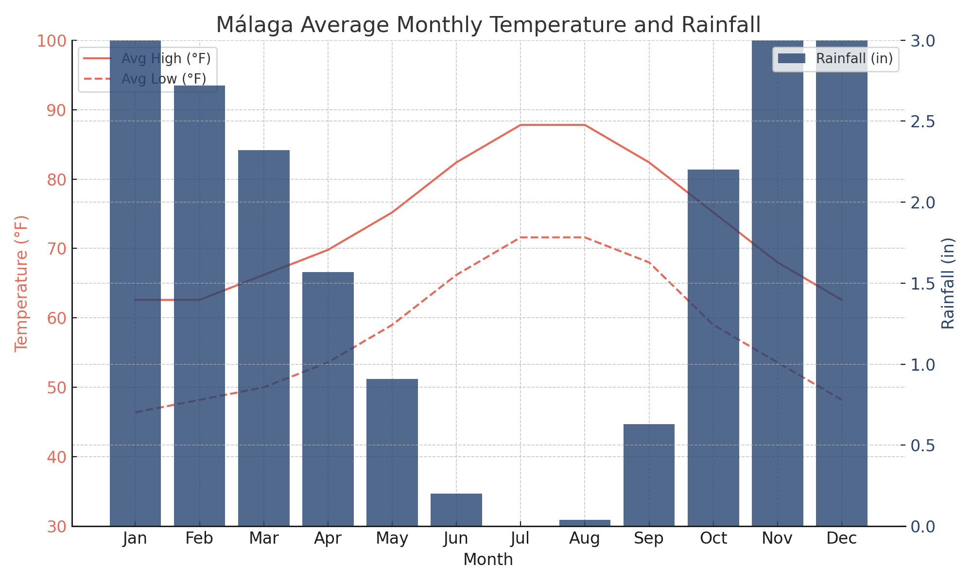 Malaga boasts a pleasant Mediterranean climate, characterized by hot, sunny summers and mild winters, making it an inviting destination year-round. The best times to visit are spring and autumn, when the weather is warm but comfortable, and the city buzzes with energy. Summer temperatures, particularly in July and August, can soar above 35°C (95°F), so it’s best to explore early in the morning or after sunset. Winters are gentle and ideal for a more relaxed experience with fewer crowds. Spring is especially beautiful in Malaga, with fragrant blossoms and the lively atmosphere of Semana Santa celebrations, while autumn offers cooler nights and the charm of the harvest season. For the perfect mix of pleasant weather and local festivities, plan your visit in April, May, or September.
