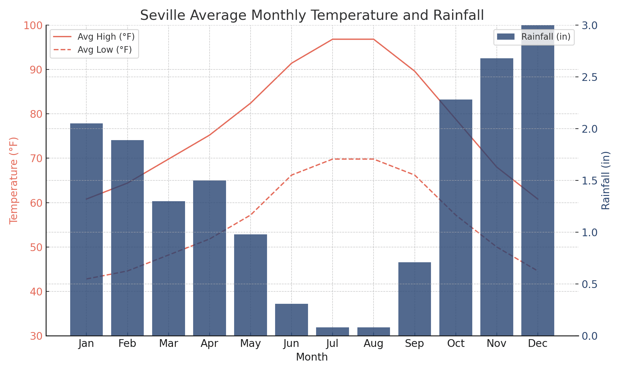 Seville enjoys a warm Mediterranean climate with long, sunny summers and mild winters, making it a year-round destination. Spring and autumn are the best times to visit, with pleasant temperatures and a vibrant atmosphere. In summer, particularly July and August, the heat can be intense, often surpassing 40°C (104°F), making early morning and evening exploration ideal. Winters are mild and perfect for quieter sightseeing.