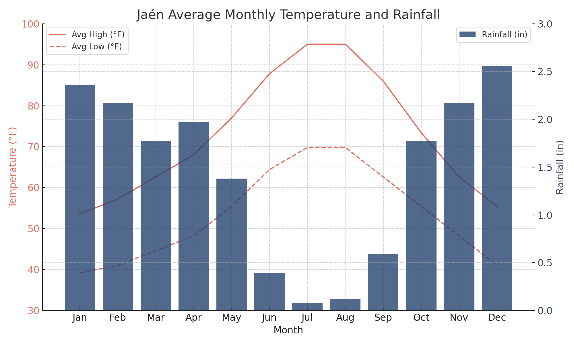 Úbeda and Baeza experience a continental Mediterranean climate, characterized by hot, dry summers and cooler winters. In July and August, temperatures can soar to around 95°F (35°C), making early mornings and evenings the best times for exploring the cities’ stunning Renaissance architecture. Winters are mild but crisp, with lows averaging 37°F (3°C) in January, offering a quieter, atmospheric setting for sightseeing. Rain is scarce, mostly falling between November and February, while spring and autumn provide the most pleasant conditions, with mild temperatures and fewer crowds—perfect for strolling through historic plazas, discovering UNESCO-listed landmarks, or enjoying the region’s olive oil festivals.
